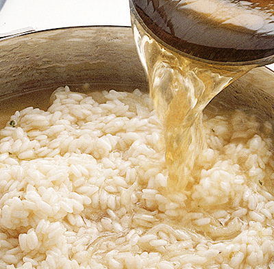 Sbuccia e affetta a velo una piccola cipolla, mettila in una casseruola con 50 g di burro e 30 g di midollo di manzo, prima scottato in acqua bollente. Fai rosolare piano finché la cipolla sarà appassita, poi butta 400 g di riso Carnaroli.