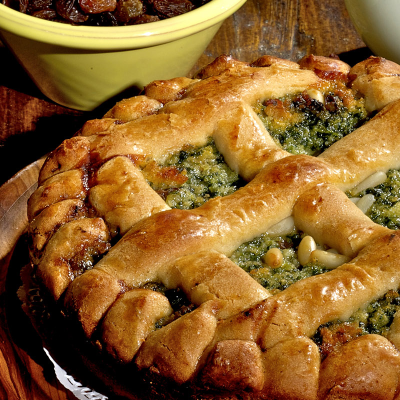 Bollire latte con vanillina e zucchero, spegnere e unire il pane a pezzi e fare ammollare bene. Passare la bietola con il passaverdure coi buchi grandi, e sfriggerla con un etto di burro, sale e pepe. Passare anche il pane dal passaverdure a buchi grossi. Mettere in una zuppiera il tutto, unire le uova intere, l'uvetta le pinole il parmigiano e un po' di saporita Bertolini. A piacere si può aggiungere un po' di bagna per dolci(archrmens). Amalgamare bene.